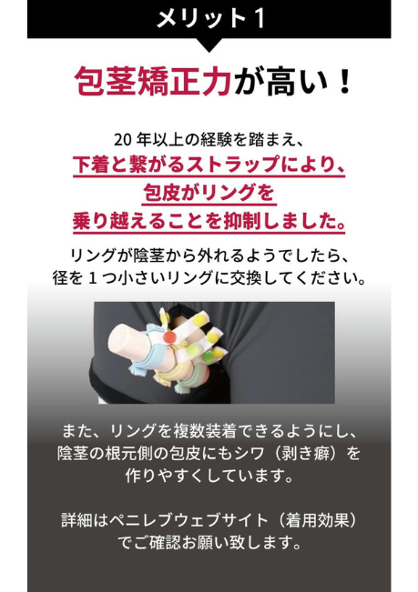 また、金属製で包皮口を広げるタイプの従来品や手術はやはり痛みを伴いますが、本製品は敏感な部分も痛くありません。着用してもらわないと改善効果は発揮できませんので、ストレスなく装着できるよう開発しました。