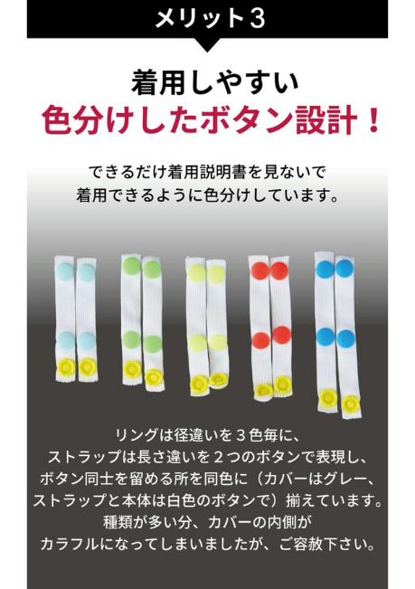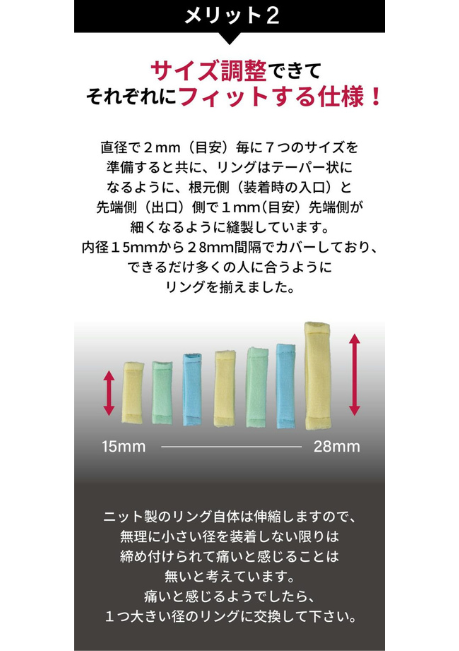 陰茎に装着するリングは7種類の径を用意し、その中からフィットするものを選んでいただきます。リングは脱落しても紛失しないよう設計し、洗濯機で洗える仕様のため管理もしやすいです。